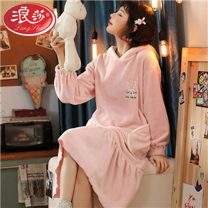 浪莎冬季法蘭絨睡裙女冬長(zhǎng)袖可愛卡通韓版帶帽睡裙家居服可外穿