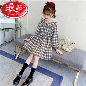 浪莎韓版女童花邊翻領(lǐng)黑白格子連衣裙2021春裝新款兒童長(zhǎng)袖公主裙