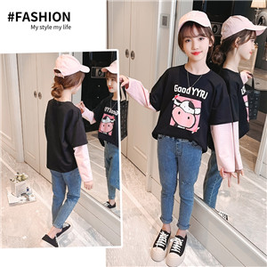 女童春夏2021新款洋氣潮流假兩件白色長(zhǎng)袖T恤休閑時(shí)髦兒童上衣女